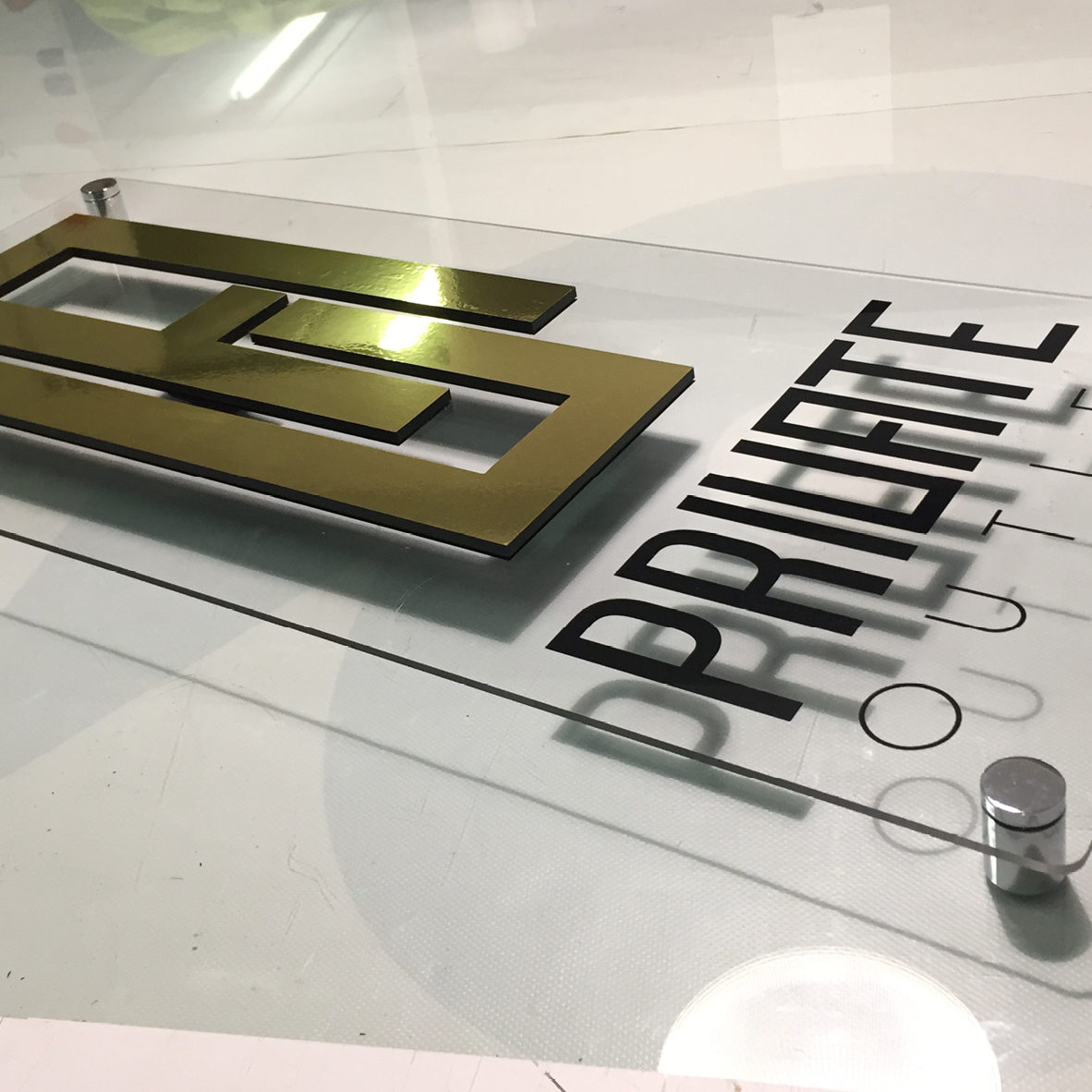Rotulación de los cristales en vinilo ácido y placa fresada en varias placas de metacrilato combinado con vinilo oro brillo.
